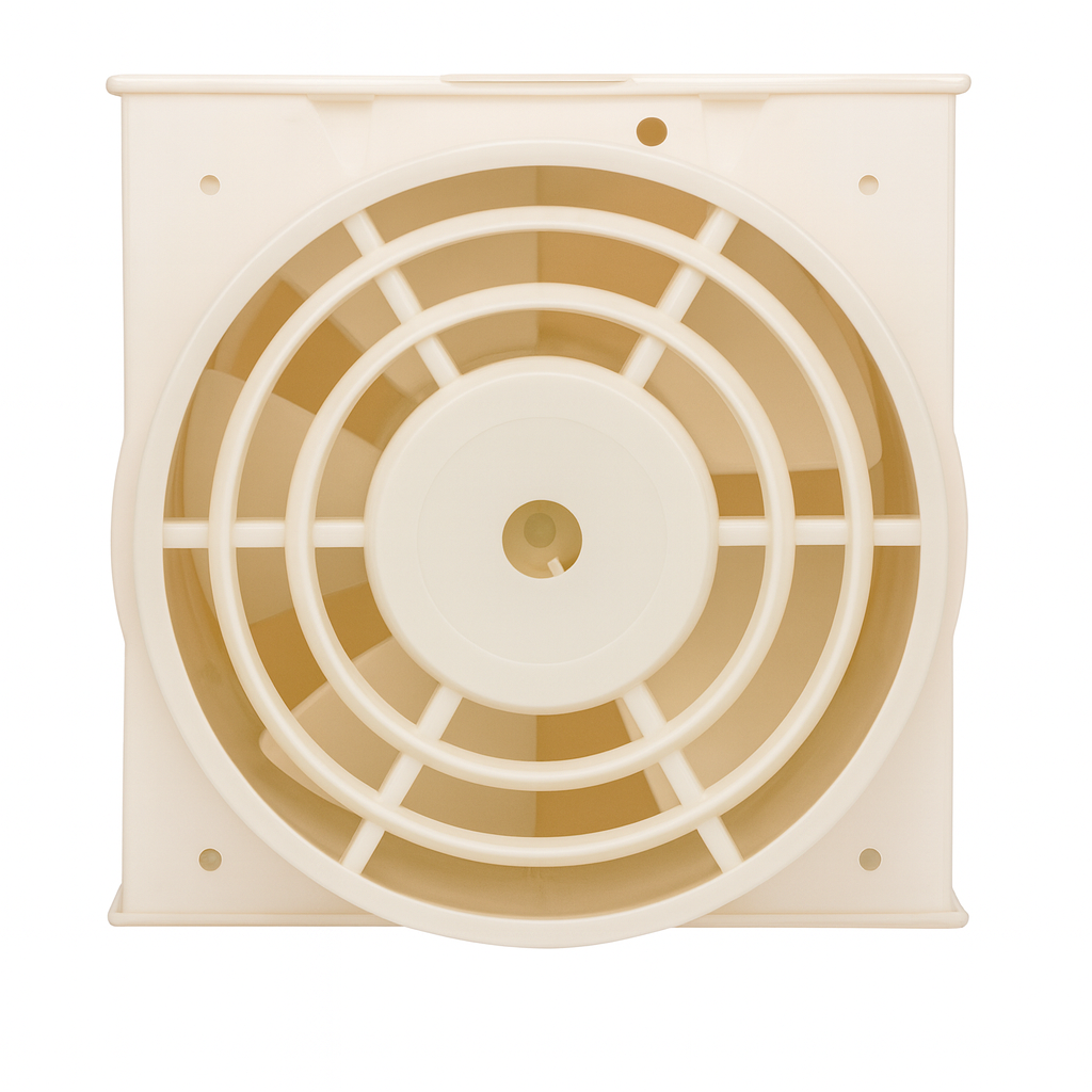 A beige plastic ventilation fan cover with a circular grill design and pre-drilled mounting holes, used for protecting fan blades while allowing smooth airflow.